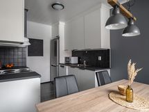 - Liesi: sähköliesi. Työtasot: laminaatti. Kylmäsäilytys: jääkaappi/pakastin. Varustus: liesituuletin, astianpesukone.