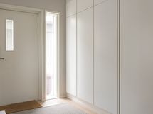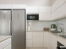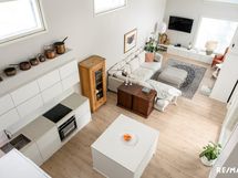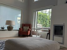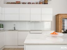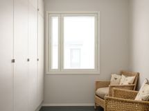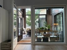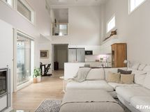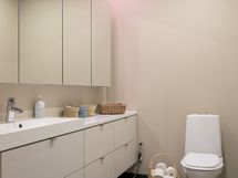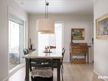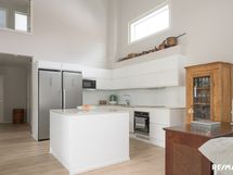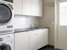 - Tilavassa keittiössä runsaasti säilytystilaa, saareke laatikostoineen, induktioliesi, erillisuuni, integroitu mikroaaltouuni, jääkaappi ja pakastinkaappi, integroitu astianpesukone, lattia Pergo laminaattia ja seinät maalattu.