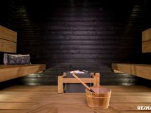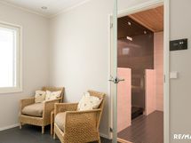 - Saunan seinät ja lauteet puuta, Tulikiven sähkökiuas, lattia laattaa.