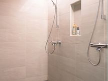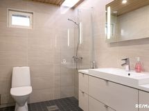 - Pesutilojen kuvaus: Alakerran kylpyhuoneen seinät ja lattiat laattaa, kaksi suihkua, lattialämmitys.