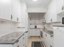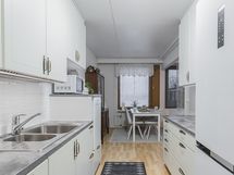 - Työtason materiaali: Laminaatti. Kaapistot, tasot, jääkaappi/pakastin, keraaminen liesi, liesituuletin, astianpesukone (45 cm). Välitila: Levy.