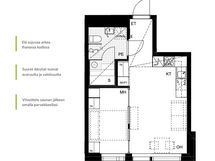 Asunnon sydämessä on tyylikäs, avokeittiöllä varustettu olohuone, jossa tammilautaparketti ja suuret ikkunat luovat valoisan tunnelman. Avokeittiössä on kaikki tarvittava moderniin ruoanlaittoon – astianpesukoneesta kalusteuuniin. Makuuhuone tarjoaa rauhallisen paikan lepoon, ja koko asuntoa ympäröi miellyttävä vesikiertoin lattialämmitys.