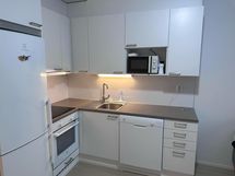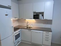 Keittiön varusteet: Jääkaappipakastin, liesituuletin, erillisuuni, liesi ja astianpesukone. Liesi: Keraaminen liesi. Työtason materiaali: Laminaatti. Kaapit, 4 levyn liesitaso, kalusteuuni, liesikupu, astianpesukone sekä jääkaappi/pakastin.