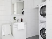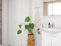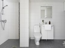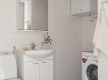 - Pesutilojen kuvaus: Tilava saunallinen kylpyhuone. Varustus: suihkuseinä, pesukoneliitäntä, lattialämmitys, wc-istuin, suihku, peilikaappi. Varustus: lattialämmitys, peilikaappi, bidee-suihku.