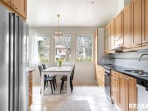 - Keittiön varusteet: Jääkaappi, erillinen pakastin, liesi, uuni, astianpesukone ja liesituuletin (Hormiin). Liesi: Induktioliesi. Työtason materiaali: Laminaatti.