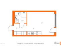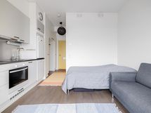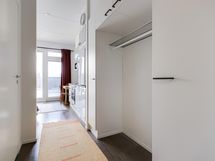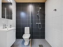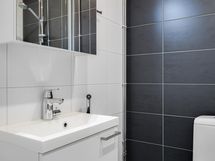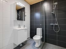 - Kylpyhuone, suihku, suihkuseinä, peilikaappi, allaskaappi, pesukoneliitäntä, lattialämmitys, kiinteät valaisimet.