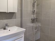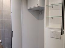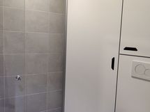 Suihkuseinä, Suihku, Pesukonevalmius, Peilikaappi, Allaskaappi, Laattalattia, Laattaseinä, Lattialämmitys