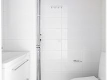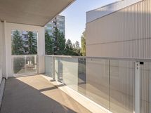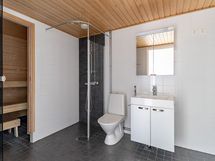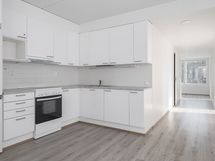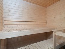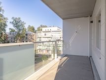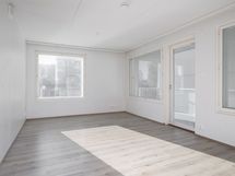 Saunallinen tehoneliö. Avokeittiö avartuu olohuoneeseen ja valosuutta lisää asunnon levyinen parveke.