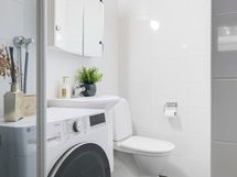 WC-istuin, bidees-uihku, allaskaappi, peilikaappi, pesukoneliitäntä, lattialämmitys.