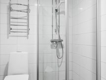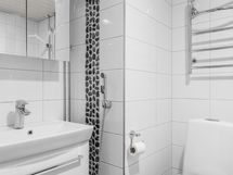 - Kylpyhuone, suihku (+suihkuseinä), peilikaappi, pesukoneliitäntä, lattialämmitys, kylpyhuonekaapisto, kiinteät valaisimet
