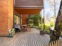 - Aidattu, iso terassialue. Pihalla viinimarjapensaita, pensaita ja istutuksia.