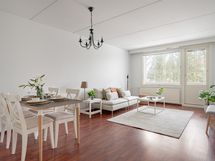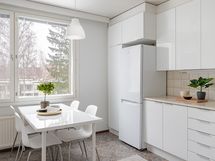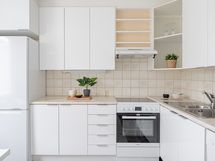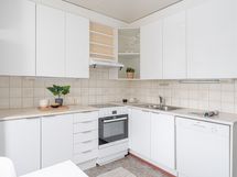 - Keittiön varusteet: Jääkaappipakastin, liesi, liesituuletin ja astianpesukone. Liesi: Keraaminen liesi. Kodinkoneita ja kaapiston ovia uusittu. Tyydyttävä kuntoinen. Muovimatto, seinät maalattu ja välitila kaakelia.
