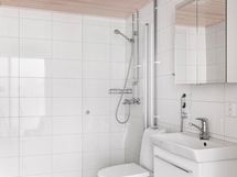 - Suihku, suihkuseinä, peili- ja allaskaappi, korkea kaappi pyykkikorilla, pesuallashana bideella, pyykinpesukoneliitäntä, pyyhekoukut