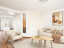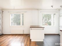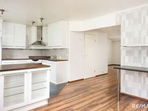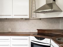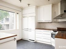 - Keittiön varusteet: Jääkaappi, erillinen pakastin, liesituuletin ja liesi. Liesi: Keraaminen liesi. Työtason materiaali: Laminaatti. Keittiö on yhdistetty yhteen makuuhuoneista poistamalla seiniä, tekee asunnosta mukavan avaran.