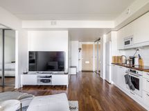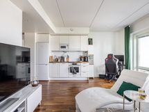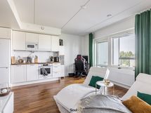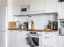 - Keittiön varusteet: Jääkaappipakastin, uuni, liesi, liesituuletin, astianpesukone ja mikroaaltouuni. Liesi: Induktioliesi.