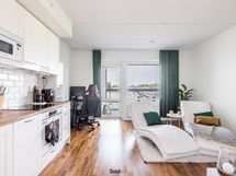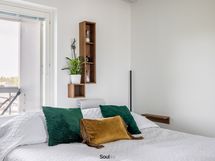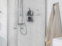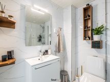 - Pesutilojen varusteet: Lattialämmitys, allaskaappi, peili, wc-istuin, bidee-suihku, pesukoneliitäntä, suihku ja suihkuseinä.
