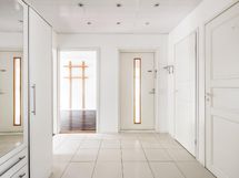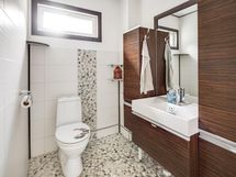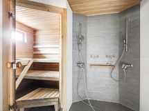 - Kylpyhuone, 2 x suihku, lattialämmitys. Sähkösauna, jossa Helo-pilarikiuas, seinät paneeli + koristekivi, lattia laatta. Erillinen wc, seinät laatta + koristekivi, lattia laatta + koristekivi, allaskaappi, kaapisto, bidee, lattialämmitys.