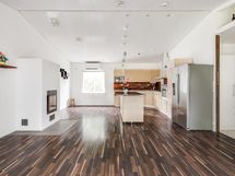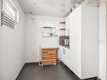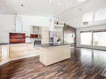 - Side by side -jääkaappi/pakastin (+ kylmävesitoiminto), induktio liesitaso, mikroaaltouuni, erillisuuni, liesikupu/-tuuletin, integroitu astianpesukone, saareke, jossa säilytystilaa, työtasot kivitasot + laminaatti