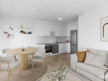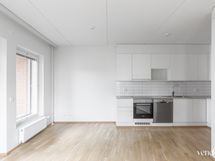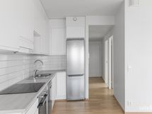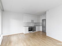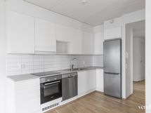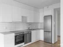 - Keittiön varusteet: Jääkaappipakastin, uuni, liesi, astianpesukone ja liesituuletin. Työtason materiaali: Laminaatti.