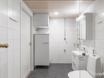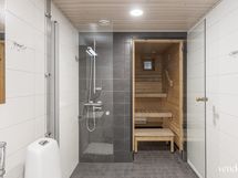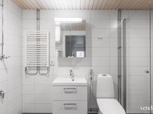 - Pesutilojen varusteet: WC-istuin, suihkuseinä, peilikaappi, bidee-suihku, allaskaappi, lattialämmitys, pesukoneliitäntä ja pyyhekuivain.