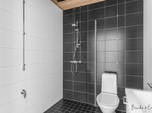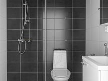 Pesutilojen kuvaus: Suihku, suihkuseinä, allaskaappi, wc-istuin, pesukoneliitäntä.