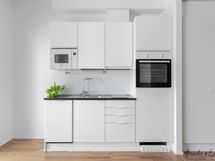kalusteeseen upotettu erillisuuni ja liesikupu sekä astianpesukone, mikroaaltouuni ja jääkaappi pakastinlokerolla.