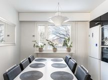 - Tilaa isolle ruokapöydälle, Paljon kaappitilaa, Paljon työskentelytilaa, Suuri tiskipöytä, Laminaattitasot, Astianpesukone, Integroidut koneet, Pesukoneliitos, Induktioliesi, Liesi tai uuni erikseen, Jää-pakastinkaappi