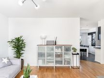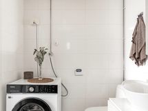 - Suihku, Suihkuseinä, Pesukone, Pesukonevalmius, Allaskaappi, Rättipatteri, Laattalattia, Halogeenivalot, Laattaseinä, Lattialämmitys, Avattava ikkuna.