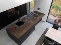 liesi, erillisuuni, 2 x jääkaappipakastin, astianpesukone, mikroaaltouuni (Junker), liesikupu (Vilpe huippuimurilla). Työtasot: Kivi. Lattia: laattalattia (suurlaatta 120x240).