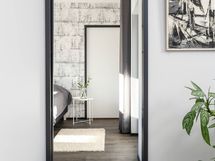 peilikaappi, allaskaappi (tasot laatta), pidee-suihku. Seinät: laatta. Lattiat: Pergo vinyyli (Modern Plank)