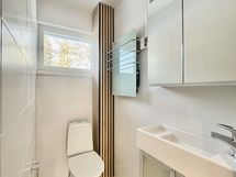 - Suihku, Pesukonevalmius, Peilikaappi, Allaskaappi, Laattalattia, Laattaseinä, Lattialämmitys, Erillinen WC