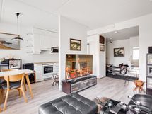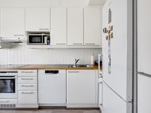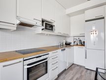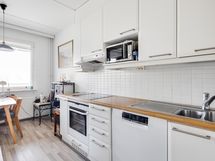 - Keittiön varusteet: Jääkaappipakastin, liesituuletin ja astianpesukone. Liesi: Keraaminen liesi. Työtason materiaali: Laminaatti.