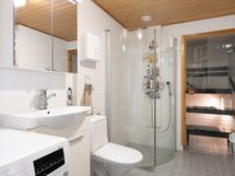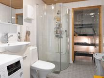 - Pesutilojen varusteet: WC-istuin, suihkukaappi, pesukoneliitäntä, bidee-suihku, peili, pesuallas ja allaskaappi.