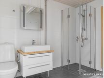 - Pesutilojen kuvaus: Varustus: Suihku, suihkuovet, valopeili, allaskaappi, wc-istuin, bidee-suihku, kuivauspatteri, lattialämmitys, kiinteät valaisimet. Erillisen WC:n kuvaus: Varustus: wc-istuin, bidee-suihku, peili, käsienpesuallas, pesukoneliitäntä (pesutorni), lattiakaivo