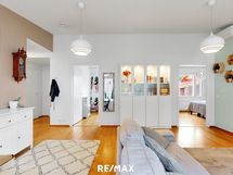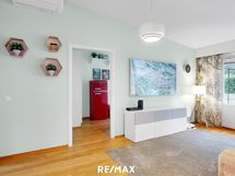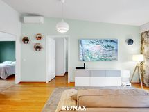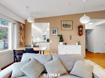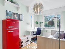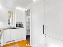 - Vaaleasävyinen tyylikäs keittiö, jonka varustuksiin kuuluu liesitaso, kalusteuuni, astianpesukone, integroitu jääkaappipakastin ja liesituuletin. Työtasot ovat kiveä, välitila laatoitettu, seinät maalatut ja lattia parkettia. Keittiön yhteydessä on erillinen kodinhoitotila.