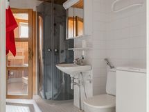 - Sauna, sähkökiuas, kylpyhuone, suihku, peilikaappi, pesukoneliitäntä, lattialämmitys, pyyhekuivain.