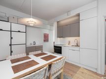 - Keittiön varusteet: Jääkaappipakastin, liesi (liesitaso), erillisuuni, astianpesukone ja liesituuletin. Liesi: Keraaminen liesi. Työtason materiaali: Laminaatti.