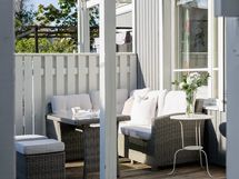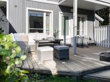 Oma suojaisa piha-alue avautuu lounaaseen ja sen terassilla voi nauttia vaikka aamukahvit auringossa. Vehreä pikku puutarha ilahduttaa ympäri vuoden - pionit, laventelit, mansikat, raparperit ja viinimarjat tuovat väriä, eloa ja kesän maun huulille. Pihan portti avaa kulun suoraan taloyhtiön leikkipaikalle - ihanteellinen ratkaisu lapsiperheelle.