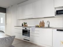 - VARUSTUS: Keraaminen keittotaso, liesituuletin, erillisuuni, jääkaappi, pakastinkaappi, astianpesukone, kaapistot, pesuallas, allashana, kiinteät valaisimet.