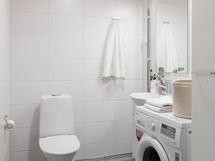 VARUSTUS: Wc-istuin, pesuallas, allaskaluste, pesuhana, bideesuihku, peili kiinteällä valaisimella, pyyhekoukut, pesukoneliitäntä, pyykkikaappi.