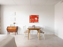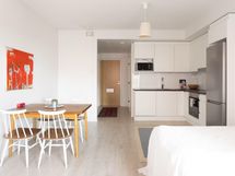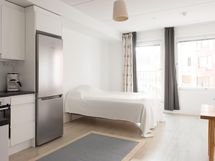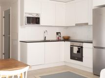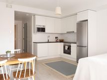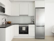 - Jääkaappi/pakastin, astianpesukone, erillisuuni, induktioliesi, liesituuletin, kaapistot, kiinteät valaisimet, keittiötaso laminaattia