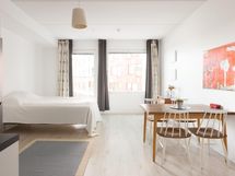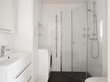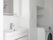 - Suihku, suihkuseinät, wc, bidee-suihku, peili, kylpyhuonekaapisto, pesukoneliitäntä, kiinteät valaisimet, lattialämmitys