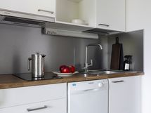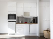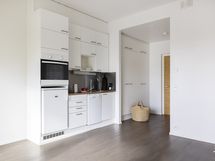 Keittotilassa on kaikki tarpeellinen pienessä paketissa: jääkaappi, astianpesukone, liesi ja erillisuuni tekevät kokkailusta mutkatonta. Kylpyhuone on moderni ja käytännöllinen, varustettu lattialämmityksellä, suihkuseinällä ja pesukoneliitännällä. Lattioiden parketti ja vaaleat pinnat luovat raikkaan ja ajattoman ilmeen.