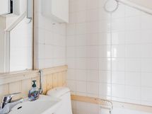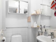 - Asunnossa on wc- ja kylpyhuonetilat kolmessa kerroksessa: yläkerrassa 2002 valmistunut kylpyhuone ammeella, suihkulla, allaskaapilla, peilillä ja erillisellä wc:llä, lattia laatoitettu, seinät pellavatapettia/laattta. Keski-kerroksessa erillinen wc (lattia laattaa, seinät paneelia/maalia, uusittu 2002). Kellarin kylpyhuoneessa kaksi suihkua, allas, sauna, lattialämmitys ja puukiuas, lattia ja seinät laatoitettuja.