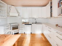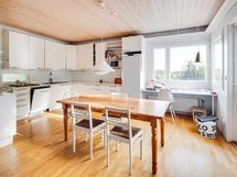 - Keittiössä on Whirlpoolin jääkaappi ja pakastekaappi, keraaminen Electrolux-liesi vuodelta 2015, liesikupu, Electrolux-astianpesukone vuodelta 2019, pesukoneliitäntä, kiinteät kaapistot ja valaisimet, pakastin Rosenlew. Keittiö sijaitsee laajennusosassa (2002) ja siihen kuuluu parveke. Vanhan puolen puuliesi on purettu ennen nykyisiä omistajia.
