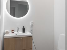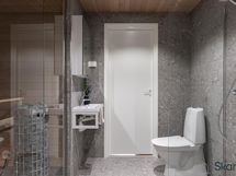 - Pesutilojen varusteet: WC-istuin, suihku (Oras sadesuihku), suihkuseinä (kirkas lasi), lattialämmitys, peilikaappi ja pesuallas. Erillisten WC:n lukumäärä: 1. Erillisen WC:n varusteet: WC-istuin, peili (Led valopeili), pesuallas, bidee-suihku, allaskaappi ja lattialämmitys.