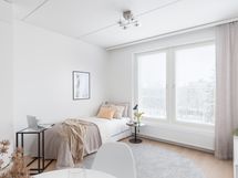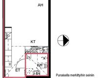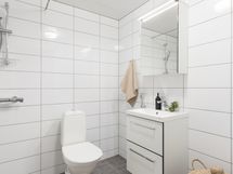 - Pesutilojen kuvaus: Kylpyhuoneissa on liitännät ja tilavaraukset pyykinpesukoneelle ja kuivausrummulle. Vesikiertoinen lattialämmitys.