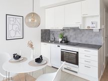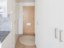 - Kaappien ovet ovat valkoisia, puusyykuvioisia mikrolaminaattiovia. Työtasot ovat laminaattipintaisia.