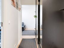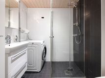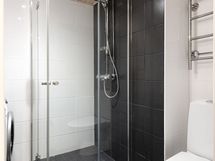 - Kylpyhuone, suihkuseinä, peilikaappi, pesukoneliitäntä. Lattia: Laatta. Seinät: Laatta