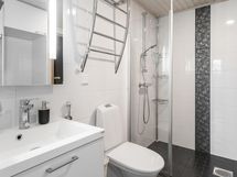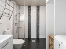- Sauna, sähkökiuas, kylpyhuone, suihku, suihkuseinä, peilit, kaapit, allaskaappi, pesukoneliitäntä, lattialämmitys Vesikiertoinen, kiinteät valaisimet. Pyyhekuivain, suihkuhylly